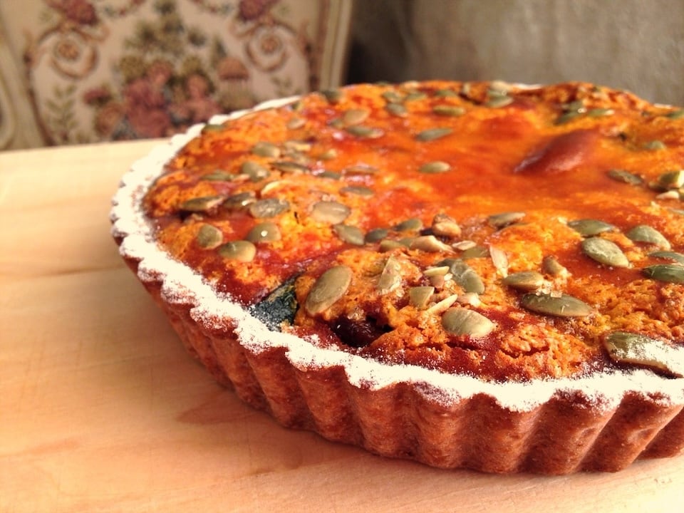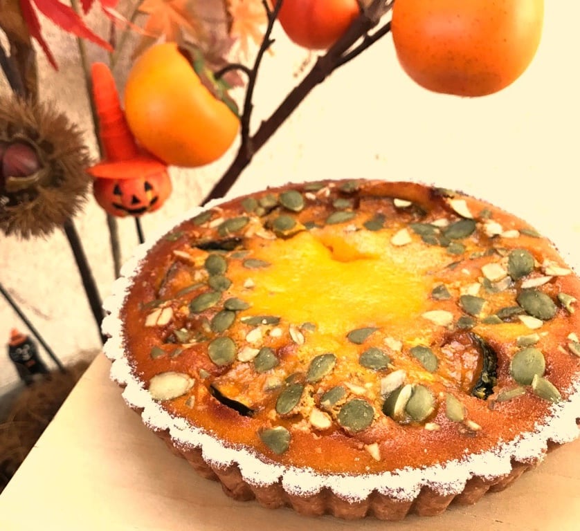 外側のタルト生地はサクッと、中のクリームはしっとりと、具材のかぼちゃはほっくりと、表面のかぼちゃの種はカリッとした、様々な食感のコントラストをお楽しみいただければ幸いです^^
